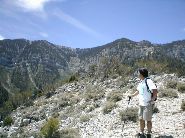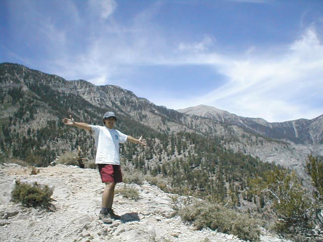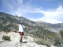 Daryn on the peak of Cathedral Rock w/ Mt. Charleston in the background